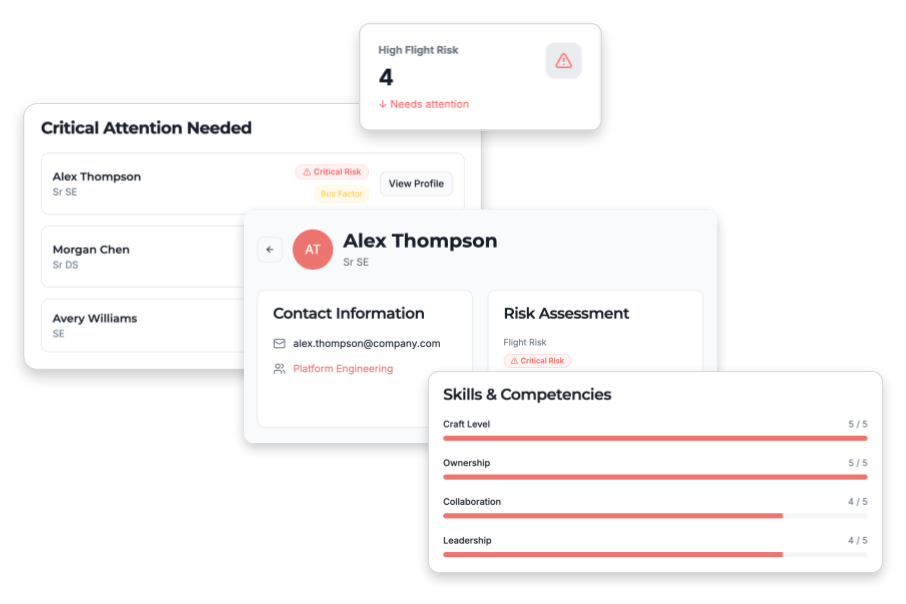 Click on any team member to see their complete profile, including risk assessments, career development path, and skill competencies all in one place.