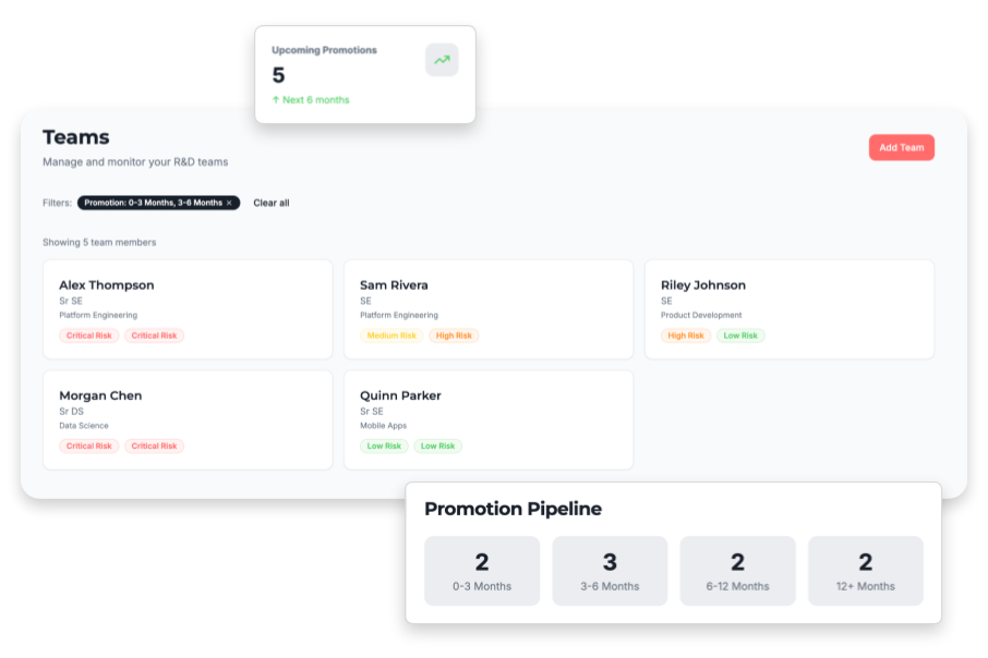 Visualize your team’s health with comprehensive charts and graphs. Understand risk distribution, promotion timelines, and contribution levels at a glance.